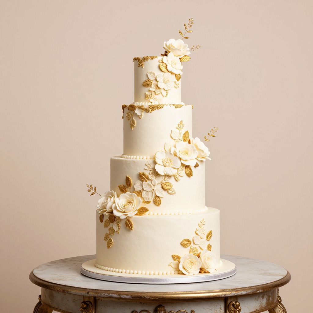 Elegant tiered cake adorned with intricate floral decorations and gold accents, placed on a vintage table with soft pastel background, artistic lighting highlighting textures, luxurious and festive celebration scene, highly detailed confectionery art