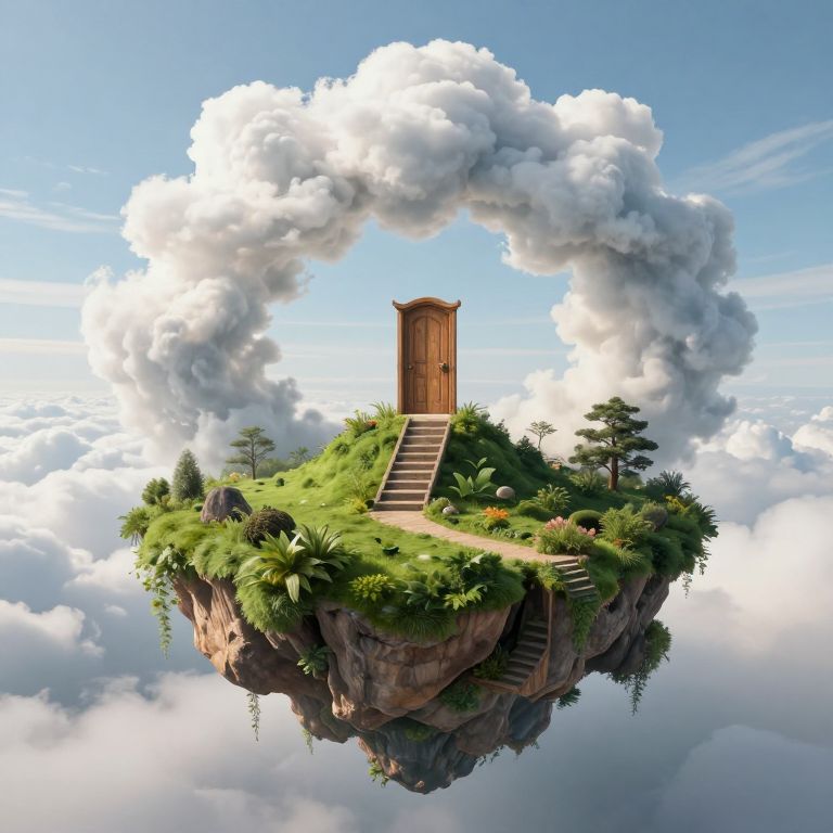 A whimsical floating island, crowned by a cloud-formed archway, ascends into the heavens, its lush green surface spiraling toward a mysterious wooden door perched atop a staircase, inviting passage to realms beyond comprehension.