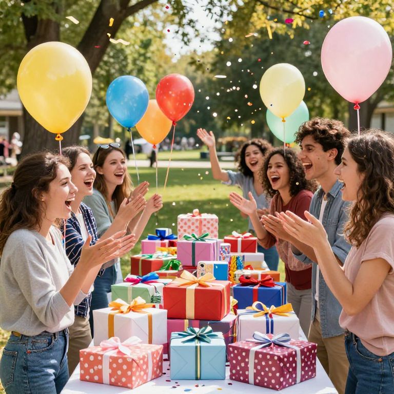 Giveaway event scene with colorful balloons and confetti, people excitedly gathered around a large table filled with gift boxes and prizes, bright festive decorations, sunny outdoor park setting, vibrant joyful atmosphere, realistic style, detailed faces and expressions