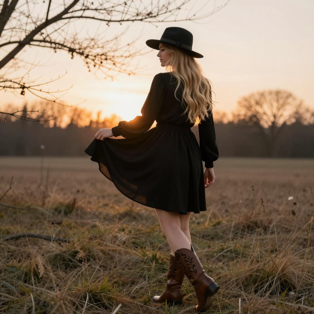 Photograph of a woman with long blonde hair, wearing a black dress and hat, standing in a grassy field at sunset. She faces away, holding up her dress with one hand. Sunlight glows behind her head. She wears brown boots with black patterns. Bare tree branches and distant trees are in the background. The ground is covered in dry grass. Her body is slightly turned to the right.