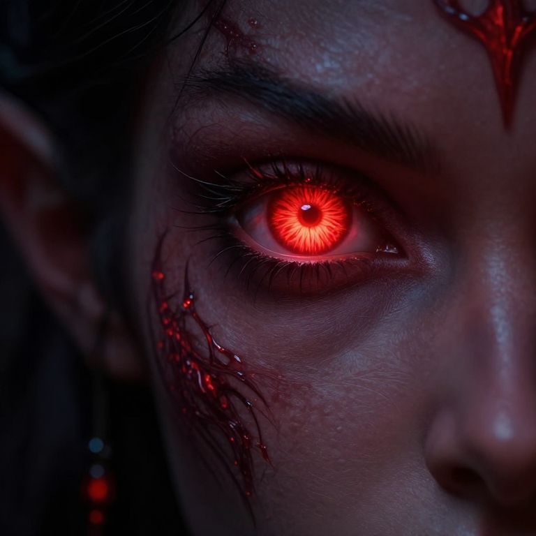 Tiefling eye color glowing vividly in a dark fantasy setting, fiery red irises with intricate patterns, mystical aura surrounding deep demonic gaze, sharp features, cinematic lighting