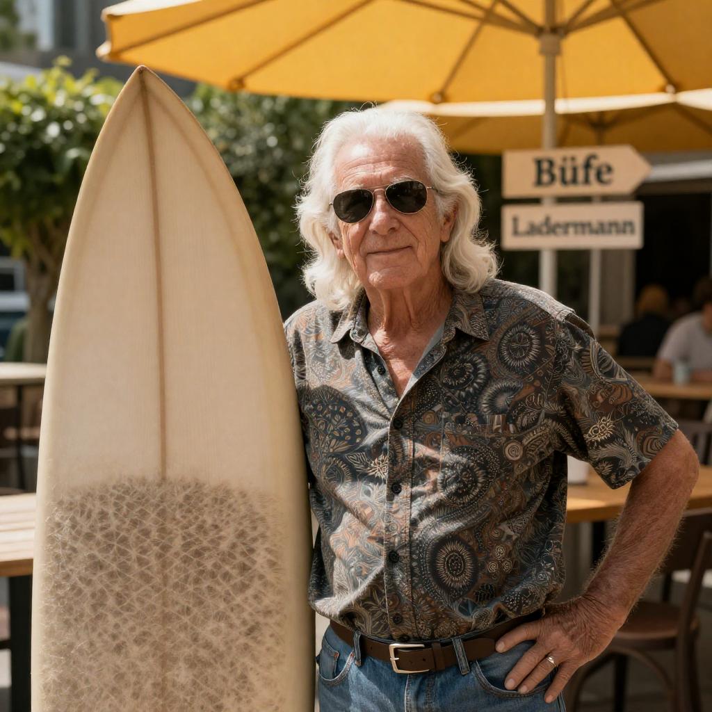 Old man with long white hair, sunglasses, and patterned shirt leaning against a wooden surfboard. Outdoor café with yellow umbrellas, greenery, and signage in background. Casual pose, slight smile. Two signs in background, one pointing to "Büfe" and another to "Ladermann". Sunlit scene.
