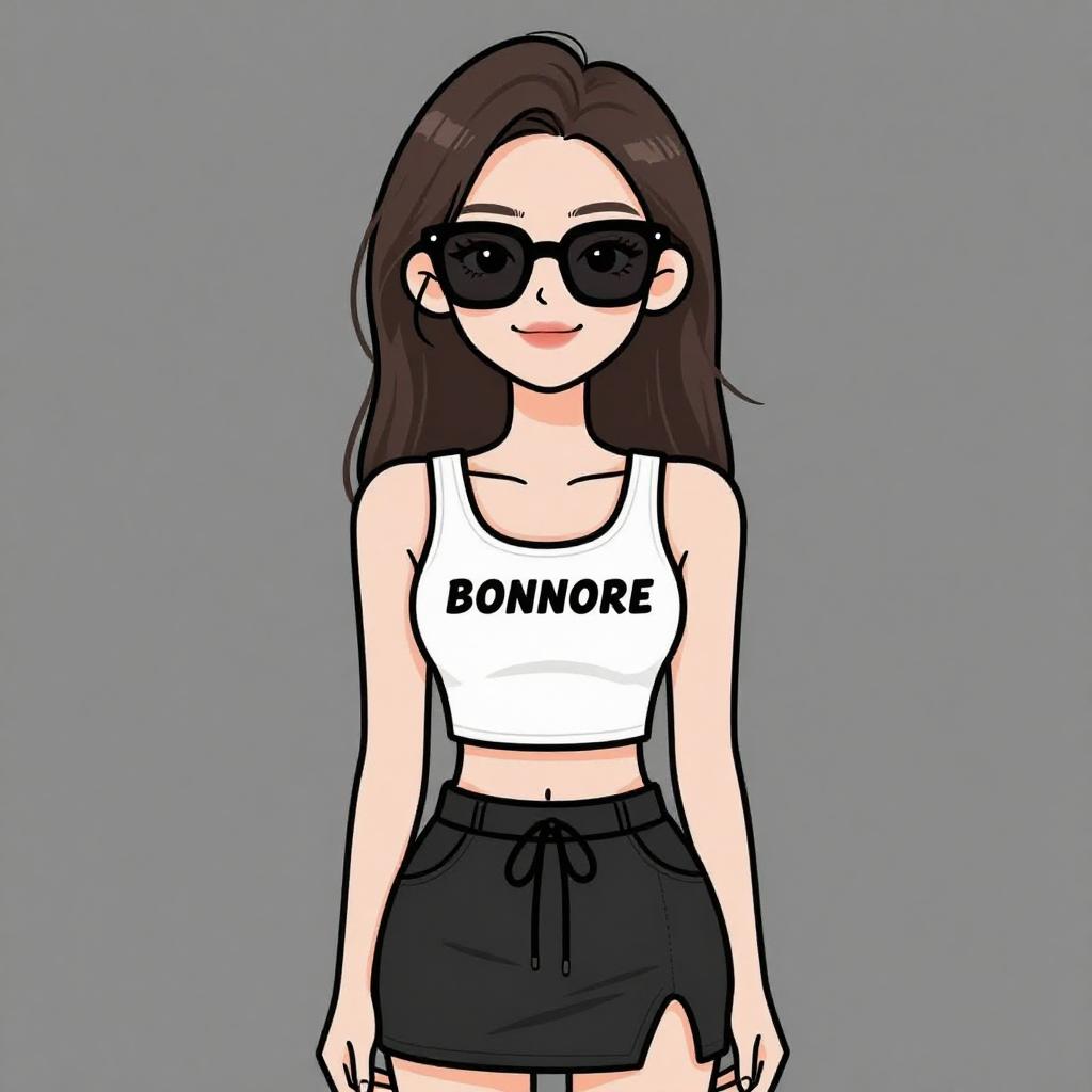 Digital drawing of a young woman with pale skin and long, straight dark brown hair. She wears black, oval-shaped sunglasses and a white tank top with the word "BONNORE" in bold black letters. She also wears black, high-waisted shorts with a drawstring. Her lips are slightly curved in a subtle smile. The background is a solid, light gray color. The style is cartoonish with clean lines and flat colors. Her physique is slender with a small bust. The overall image has a casual, modern aesthetic.