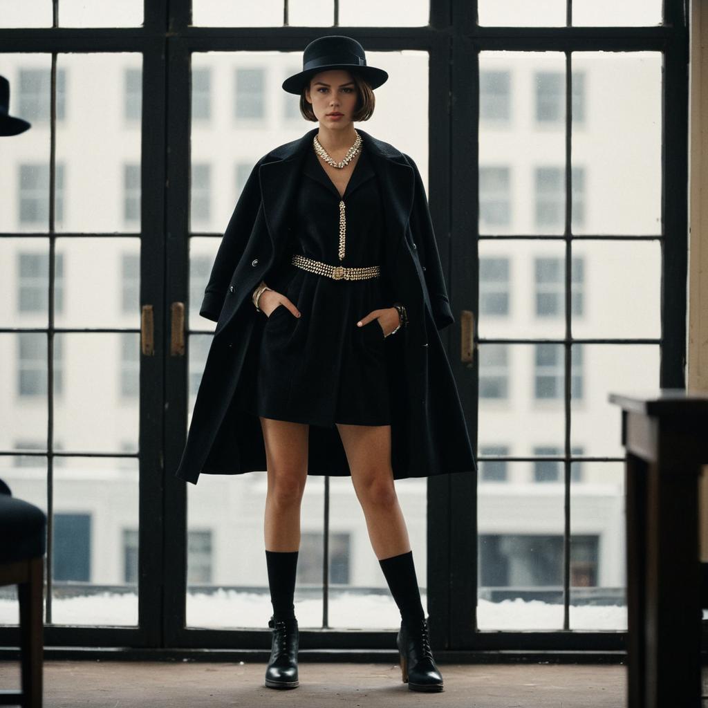 A confident woman standing indoors in front of large windows, dressed in a black long coat draped over her shoulders, a short black dress with pearl or rhinestone embellishments, a matching belt, and black heeled boots. She wears a black hat and a statement necklace, accessorized with bracelets. The background is softly blurred, focusing attention on the full-body portrait of the model with short brown hair looking directly at the camera.