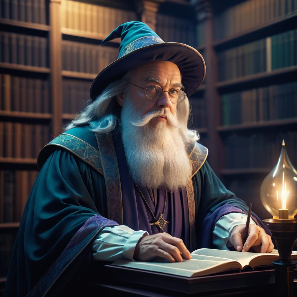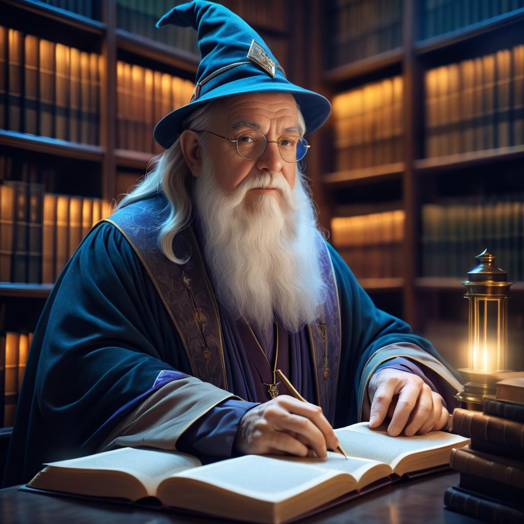 Close-up portrait of a wise older man dressed as a wizard with a long white beard and a blue pointed hat, seated in a dimly lit library filled with bookshelves. The wizard writes in an open ancient book, surrounded by stacks of old books and a glowing vintage lantern, creating a mystical and serene atmosphere.