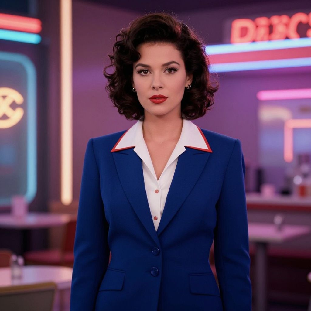 Photograph of a woman with fair skin and dark, curly hair styled in a 1950s fashion. She has bold red lipstick and wears a navy blue blazer with a white shirt, featuring a red trim on the collar. She stands in a brightly lit diner, with neon signs in the background displaying "DINER" and a clock. The diner has a retro aesthetic with red and blue neon lights. The background is slightly blurred, focusing attention on the woman. Her expression is serious and confident, with a slight tilt to her head.