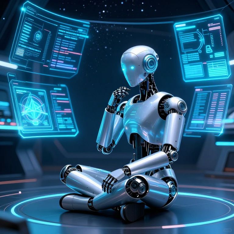 Photograph of a sleek, silver robot with a humanoid shape, seated cross-legged on a glowing, circular platform in a futuristic, dark space-themed room. The robot has a shiny, metallic surface with visible joints and blue-lit accents. Surrounding the robot are floating holographic screens displaying various technical data and diagrams in vibrant blue and white. The background features a starry, black space backdrop, enhancing the sci-fi atmosphere. The robot's head is slightly tilted, and its right hand is raised to its chin in a thoughtful pose.