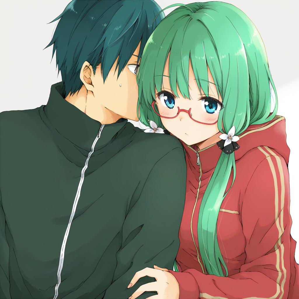 Digital anime-style illustration featuring two characters. A young man with short dark teal hair and a dark green zip-up jacket is whispering closely to a girl with long green hair, blue eyes, and red glasses. The girl wears a red jacket with gold stripes and has white flower hair accessories. The artwork is detailed with soft shading and smooth linework in a modern anime style.