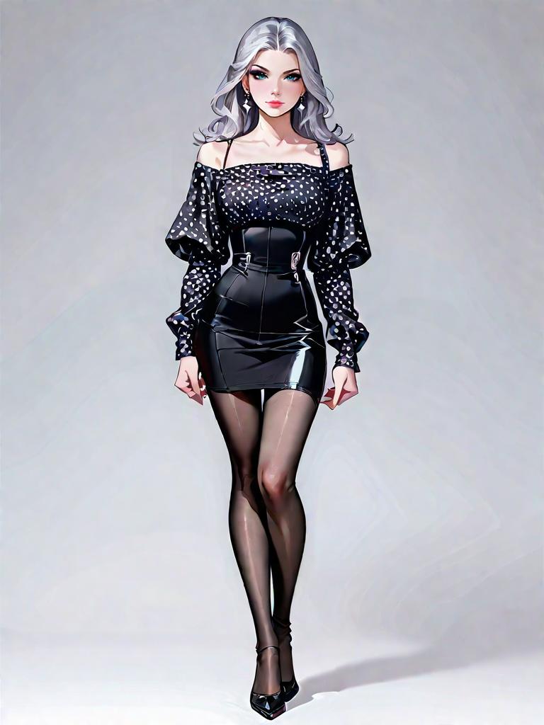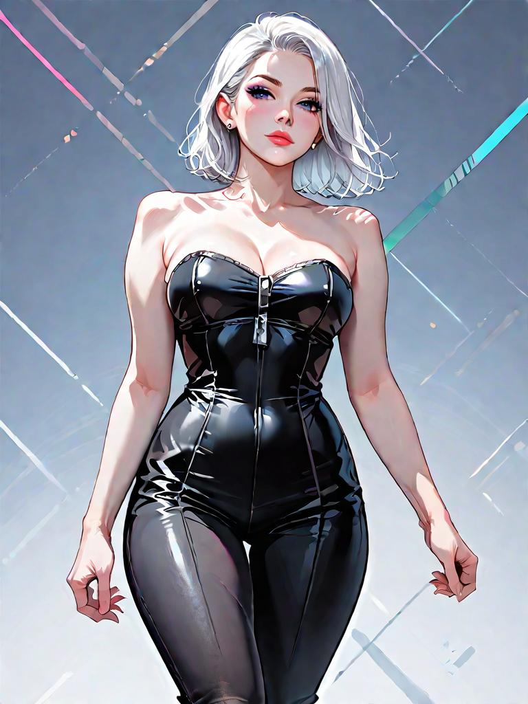 Full body illustration of a stylish woman with white hair wearing a modern black strapless romper featuring a fitted silhouette and straight across neckline. The woman stands confidently against a minimalist light-filled studio background, showcasing a realistic face and sleek, contemporary fashion.