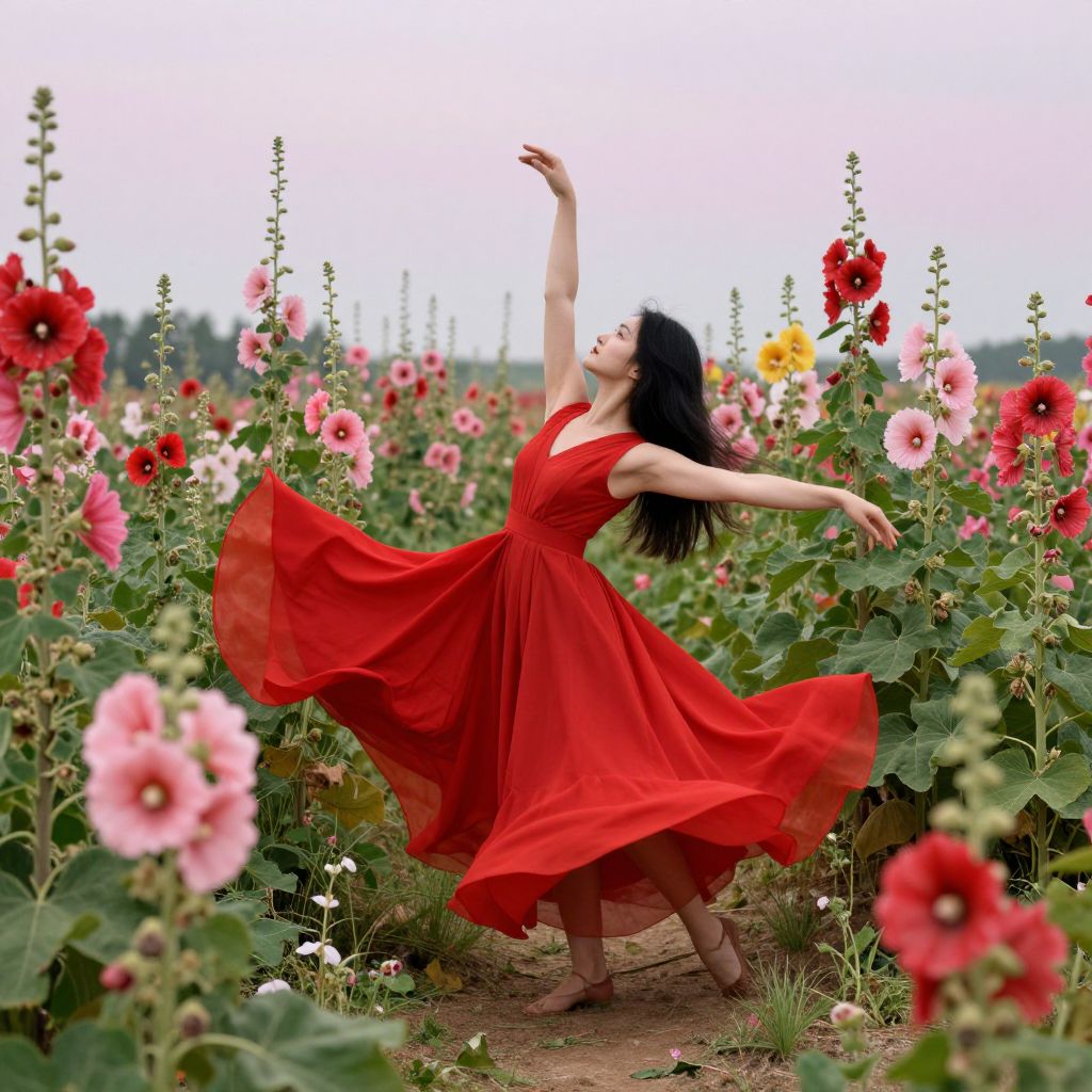 A woman in a flowing red gown dances gracefully amidst a field of vibrant hollyhocks, her silhouette and the flowers merging into a dreamlike tapestry where reality and imagination intertwine.