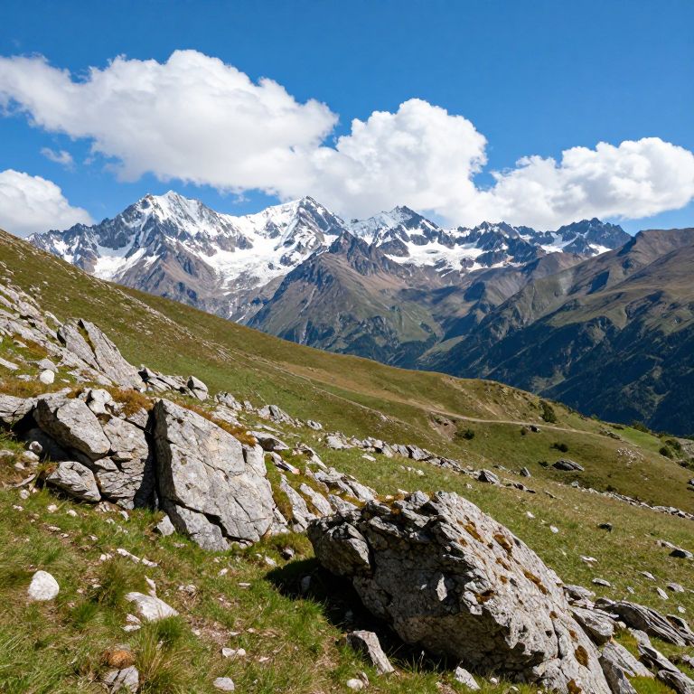 Photograph of a mountainous landscape under a bright blue sky with scattered white clouds. Snow-capped peaks dominate the background, their rugged, jagged edges contrasting with the green grassy slopes in the foreground. Large, grey rocks with sharp edges are scattered across the grassy hillside, casting shadows. The terrain is uneven, with a mix of green grass and patches of exposed earth. The sunlight highlights the textures of the rocks and the lushness of the grass, creating a vivid and dynamic scene.