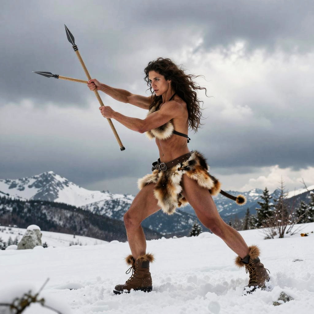 Beautiful Neanderthal woman hunting with a spear in a snowy mountainous landscape, muscular build, focused gaze, wearing animal pelts, dynamic action pose, dramatic clouds overhead