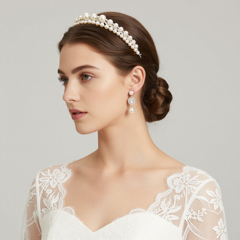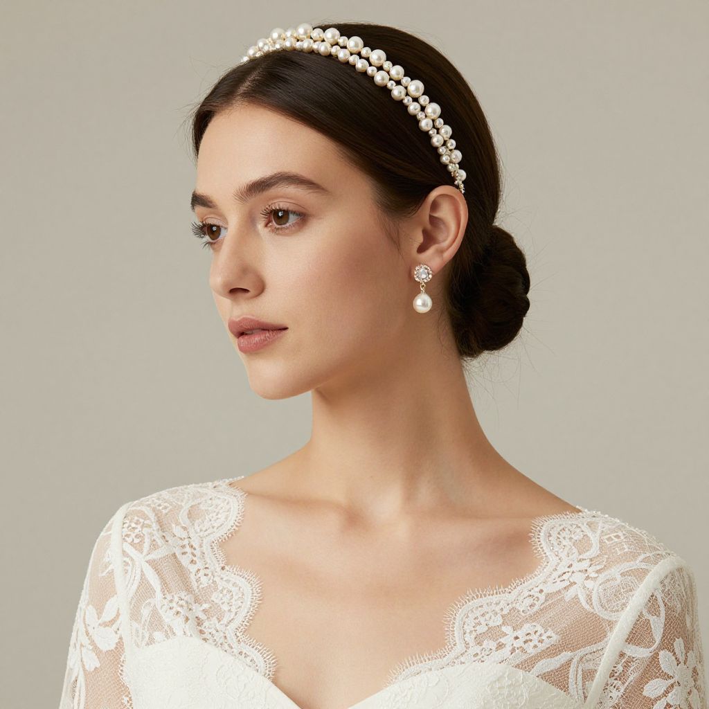 Elegant bridal ensemble featuring a woman wearing a delicate pearl headband and matching earrings, complemented by a lace-trimmed white gown, showcasing refined Canadian bridal accessories against a neutral backdrop.
