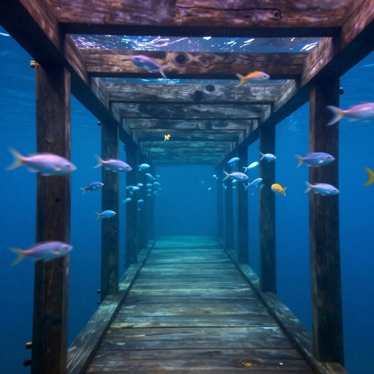A serene underwater corridor of wooden beams stretches endlessly, flanked by schools of ethereal fish that glide effortlessly between realms, their forms blurred by the interplay of light and shadow, creating a dreamlike passage where reality dissolves into the depths.
