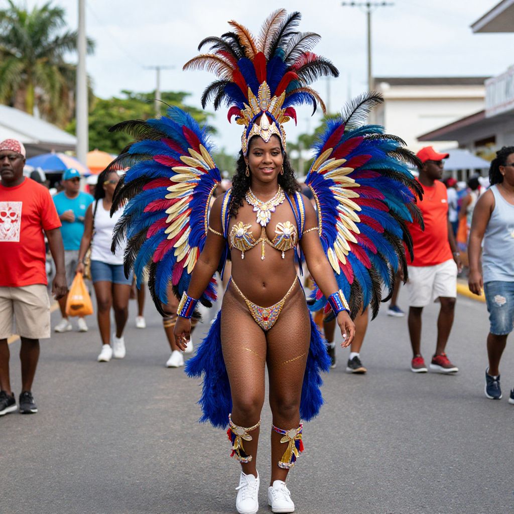 Trinidad Carnival Costume, dressed in costume walking down the street with a large feather headdress