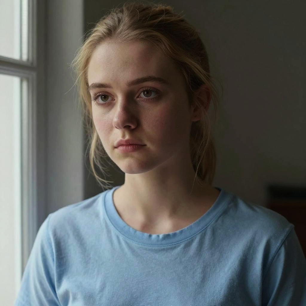 Photograph of a close-up of a young Caucasian woman with fair skin and blonde hair, styled in a casual, slightly messy manner. She has light green eyes, subtle eyeliner, and natural pink lips. Her eyebrows are slightly arched and her expression is a gentle, slight smile. The background is blurred, with indistinct dark and muted colors, suggesting an indoor setting. The lighting is soft, highlighting her facial features and creating a gentle, natural glow on her skin. The image has a realistic, cinematic feel.