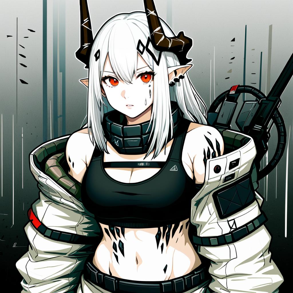 Mudrock (elite ii) (arknights), arknights, 1girl, pointy ears, horns, ear piercing, red eyes, hair between eyes, long hair, white hair, grey hair, hair ornament, large breasts, cleavage, navel, black sports bra, black gloves, bare shoulders, off shoulder, long sleeves, black choker, oripathy lesion (arknights), material growth, infection monitor (arknights), crop top, midriff, stomach, by artist arano oki, anime