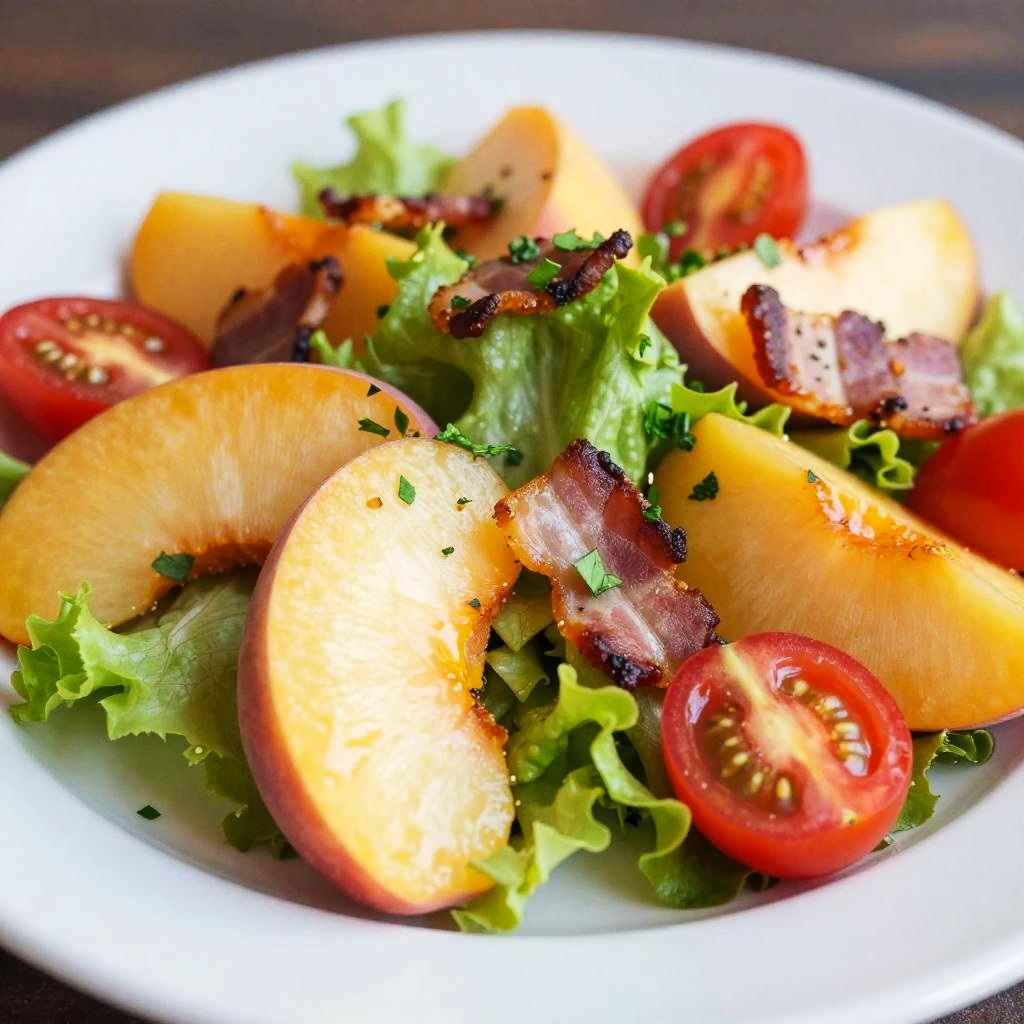 A vibrant photograph of a fresh salad in a white bowl. The salad features sliced chicken breast, hard-boiled egg halves with yellow yolks, and red cherry tomatoes, all atop a bed of green leaf lettuce. Garnished with a sprig of parsley, the salad is sprinkled with black pepper. In the background, a wicker basket filled with red and green apples rests on the white table, with a glass of pink lemonade partially visible. The image is brightly lit, emphasizing the fresh, colorful ingredients.