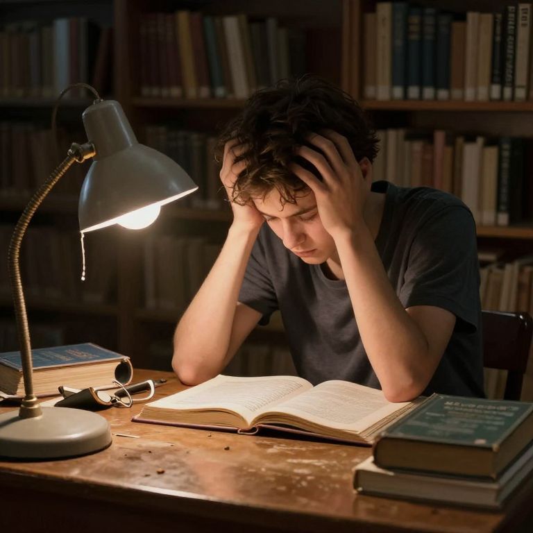 Photograph of a young man with curly brown hair, wearing a dark navy t-shirt, sitting at a wooden desk in a dimly lit library. He is deeply focused on an open book, with both hands resting on his head. A silver desk lamp with a focused beam illuminates the book, casting shadows. Beside the lamp, there are stacked books and a pair of glasses. The background features a blurred bookshelf filled with various books. The scene exudes a studious, introspective atmosphere.