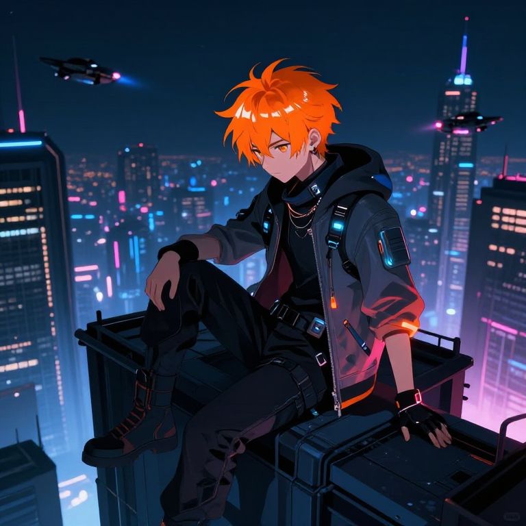 Anime boy orange hair sitting atop a futuristic city rooftop, neon lights reflecting off his spiky bright orange hair, wearing sleek cyberpunk attire with glowing accessories, dramatic night sky filled with flying vehicles and towering skyscrapers, mood of solitude and adventure