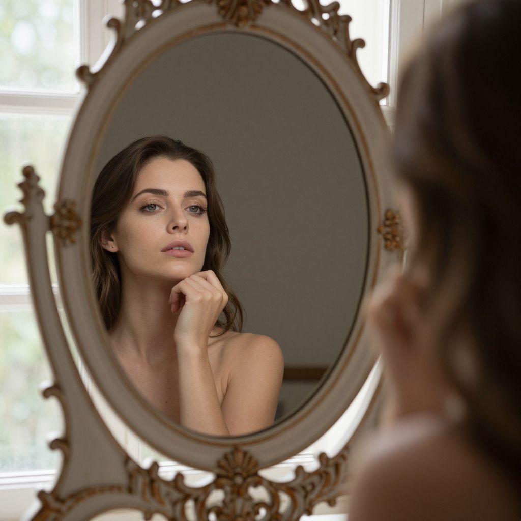 Photograph of a young woman with fair skin and dark brown, wavy hair gazing into an ornate, oval mirror with gold floral accents. She has a contemplative expression, with her chin resting on her right hand. Her bare shoulders suggest she is unclothed from the waist up. The mirror is centered in the image, with a softly lit, blurred window background. Her reflection is clear, showing her soft features and subtle makeup. The overall tone is serene and introspective.