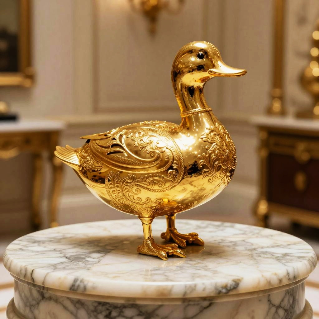 Shiny golden duck trophy displayed on a marble pedestal, intricate engraved patterns with elegant design, soft spotlight highlighting the gleaming surface, luxury interior setting
