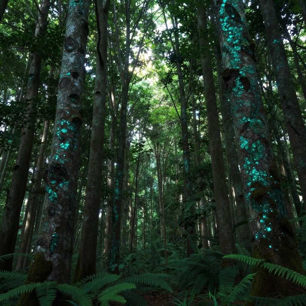 Enchanting forest scene where trees have malachite bark and leaves shimmering in deep green shades, sunlight filtering through canopy, mystical atmosphere, hyperrealistic illustration, fantasy nature environment with magical details