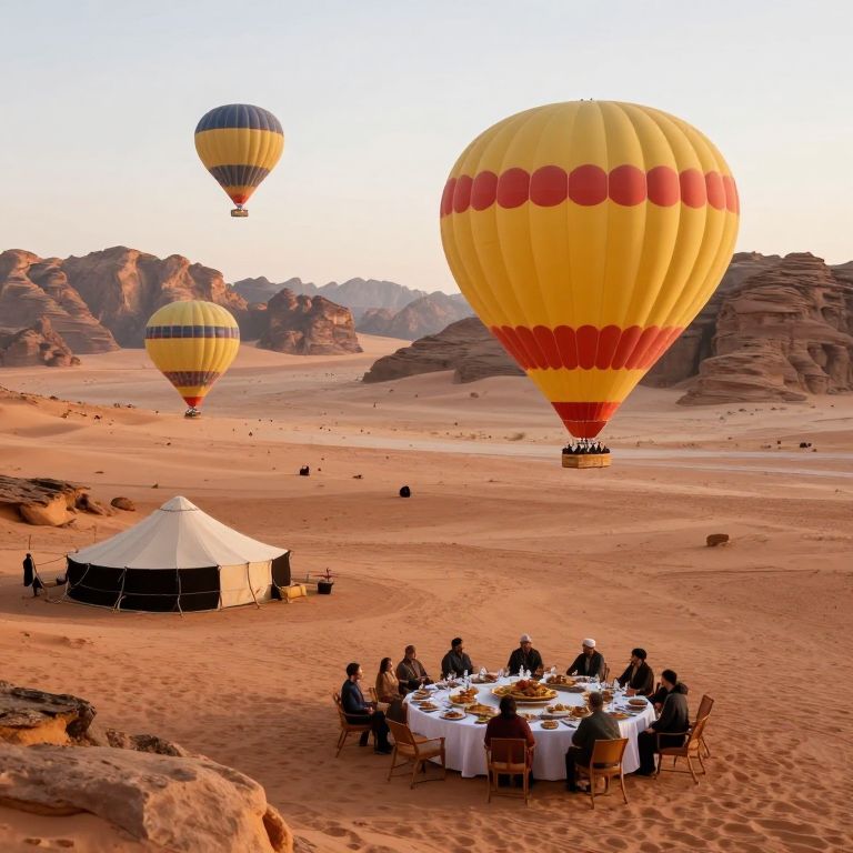 Photograph of a desert landscape with three colorful hot air balloons in the sky. The largest balloon, yellow with red stripes, dominates the right. Two smaller balloons, striped in yellow and blue, float left. In the foreground, a round white and black tent sits on orange sand, with a group of eight people, dressed in dark clothing, seated around a white-clothed table enjoying a meal. Rocky hills form the background under a clear, sunset sky. The scene combines adventure and tranquility, with warm, golden hues enhancing the desert's vastness.