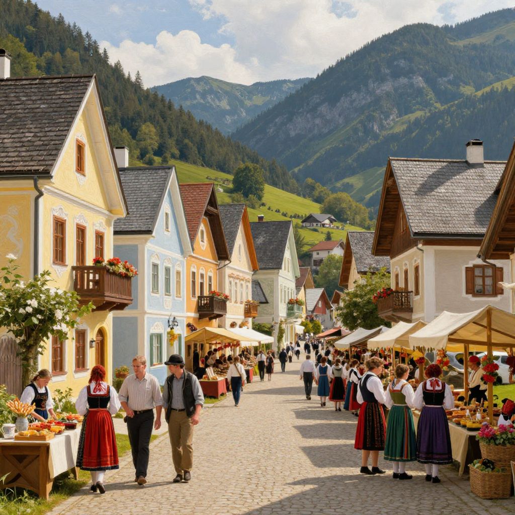 Traditional Austrian village scene, charming cobblestone streets lined with colorful historic houses, people in folk costumes enjoying a festive market, mountains in the background, warm sunlight, rich textures, painterly style, lively and vivid colors