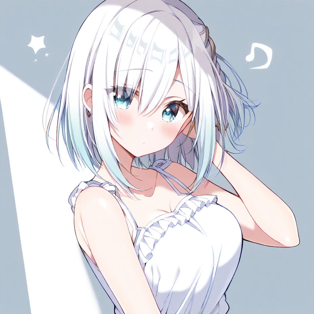 Ars almal, nijisanji, 1girl, blue eyes, hair between eyes, white hair, short hair, medium breasts, white shirt, virtual youtuber, virtual youtuber, by artist seramikku, illustrious