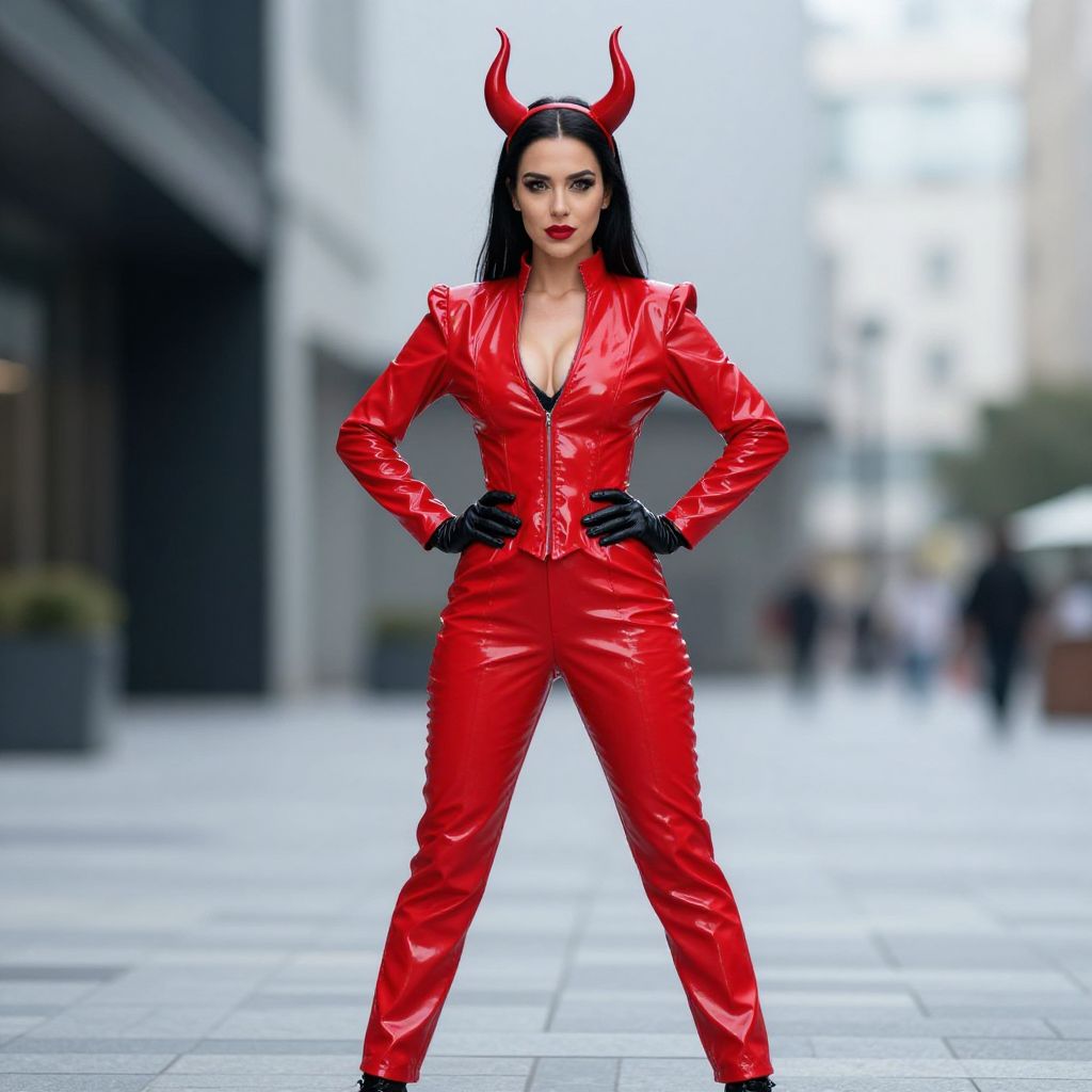 Photograph of a confident woman in a shiny red latex devil costume with horns, black gloves, and red lipstick, standing in a blurred urban street.