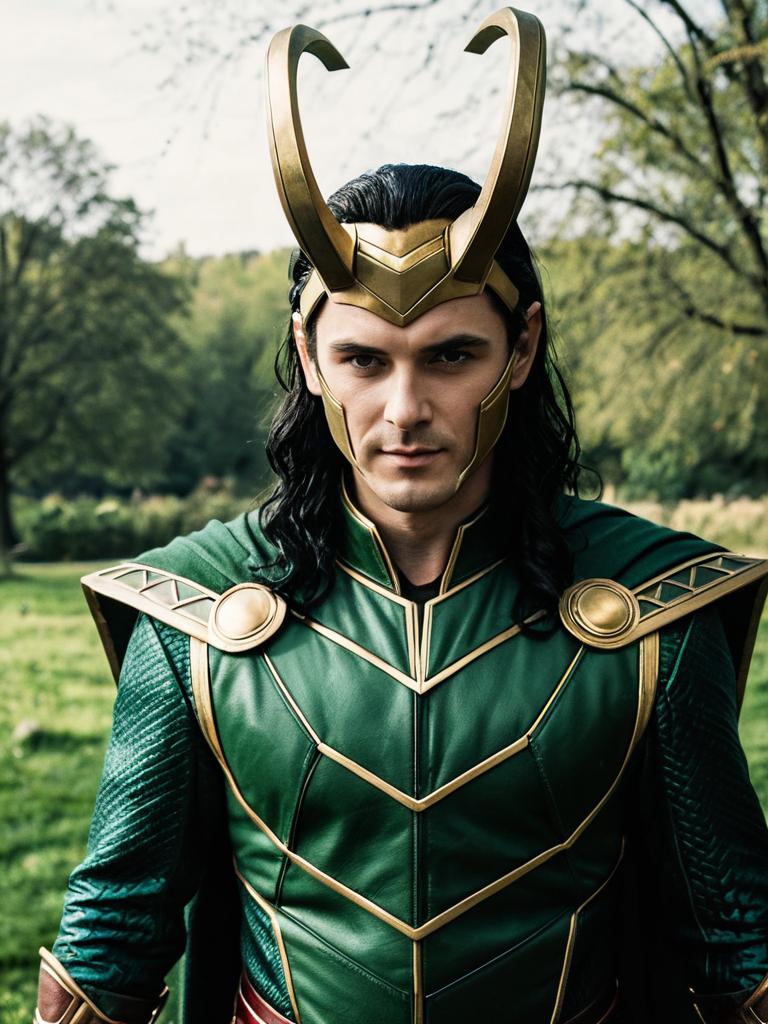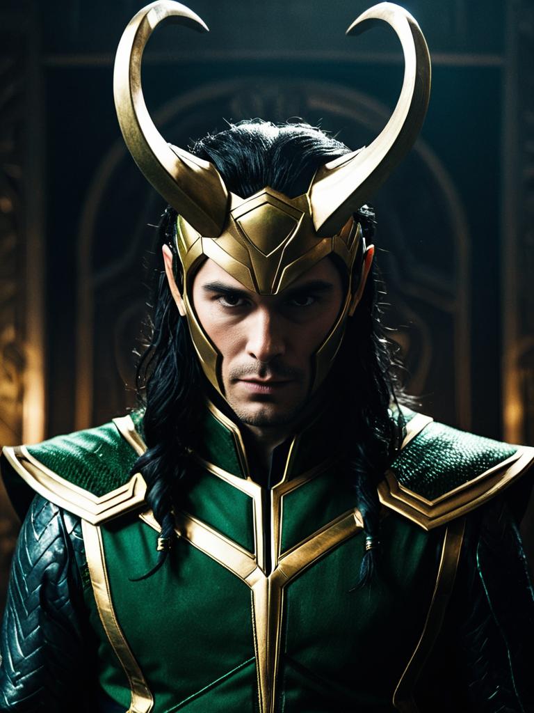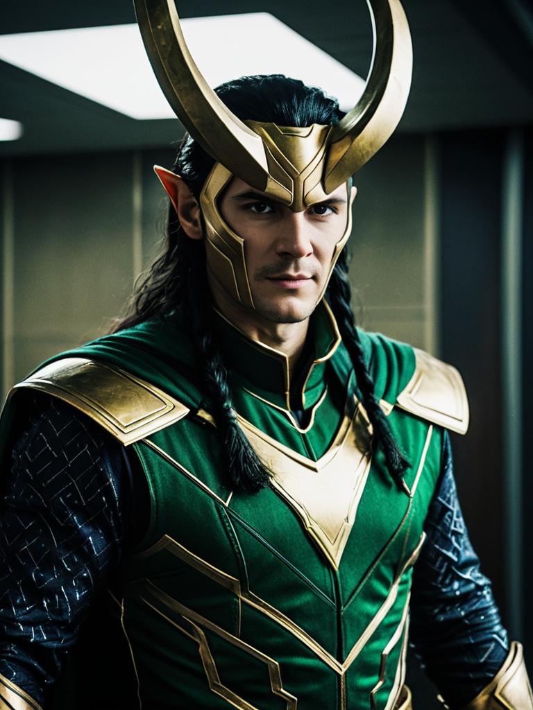 Man in Loki Classic Costume, close-up detailed headshot with golden horns