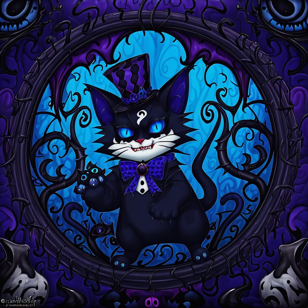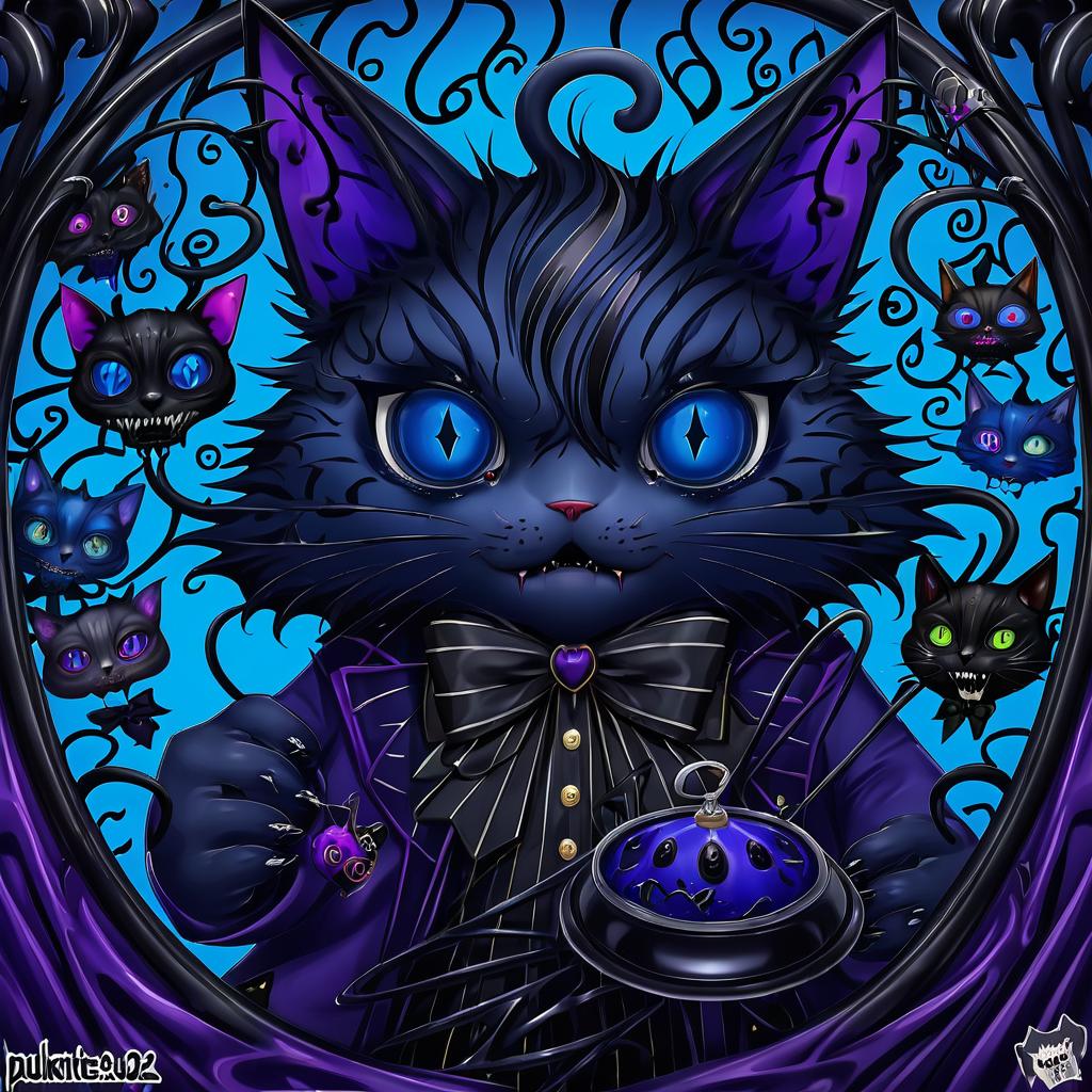 Grim (twisted wonderland), twisted wonderland, no humans, 1boy, demon tail, cat ears, blue eyes, hair between eyes, black hair, virtual youtuber, cat, blue sclera, creature, by artist sarukaiwolf, anime