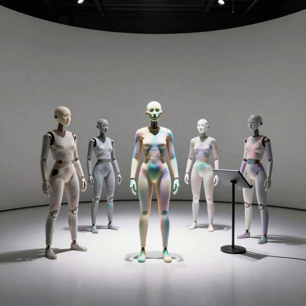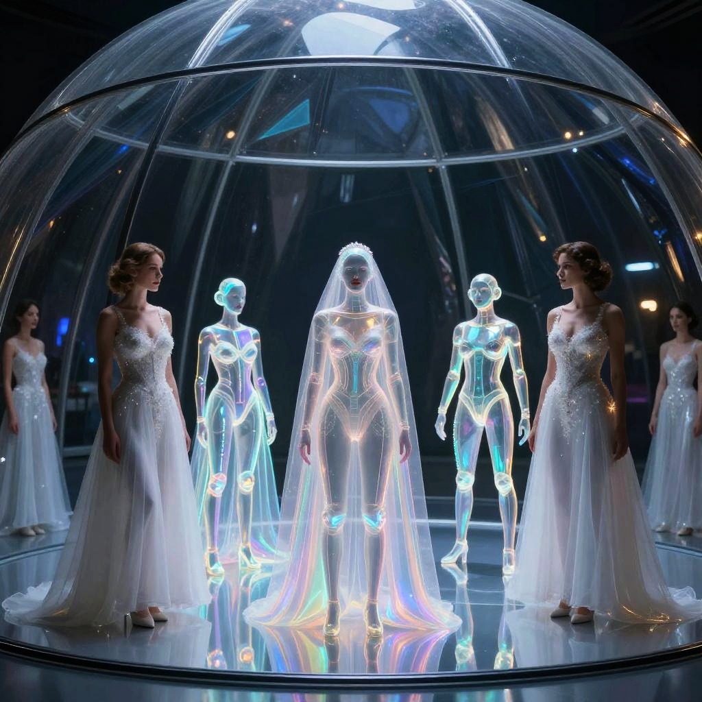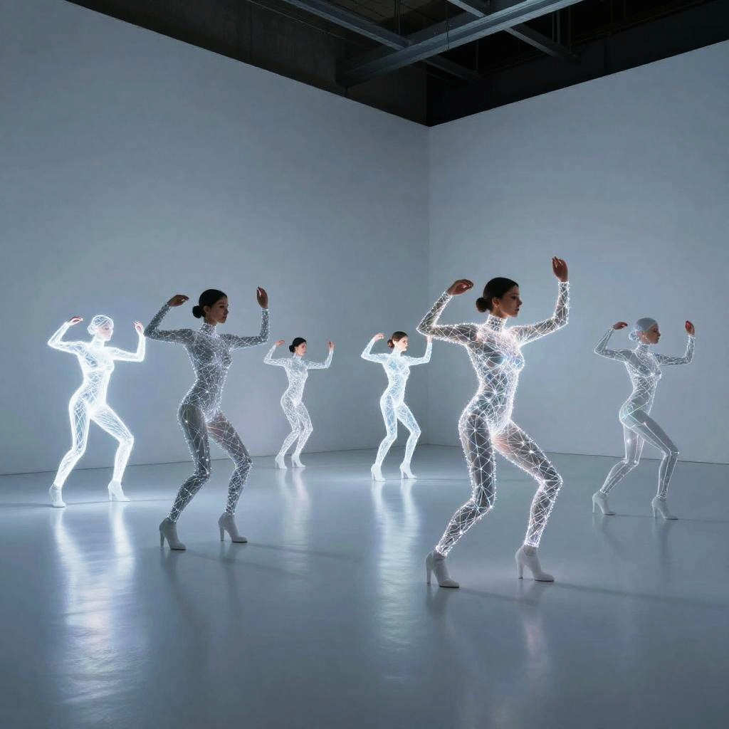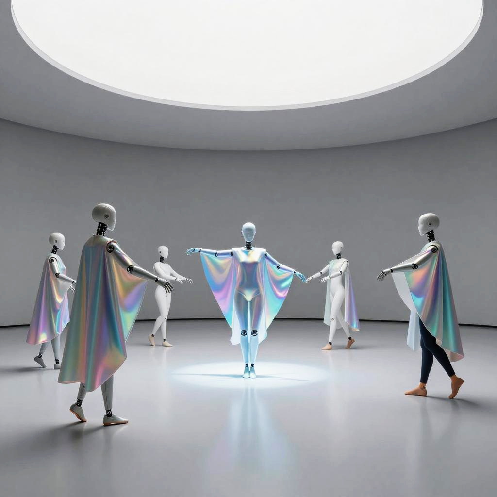 A futuristic minimalist shot of quantum hackers and interactive media painters wearing translucent light-bending garments, set in an ultramodern neural studio. Designed by Santiago Calatrava, Frank Lloyd Wright, captured with Fujifilm, experimental and stylish composition