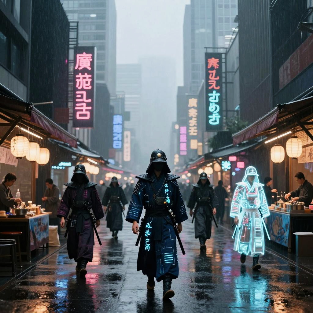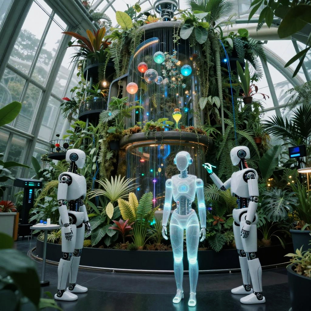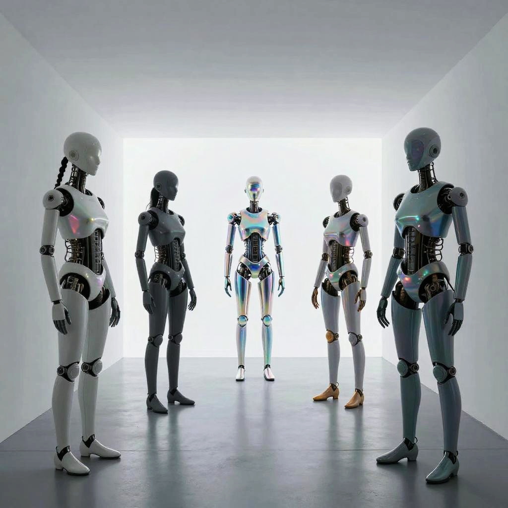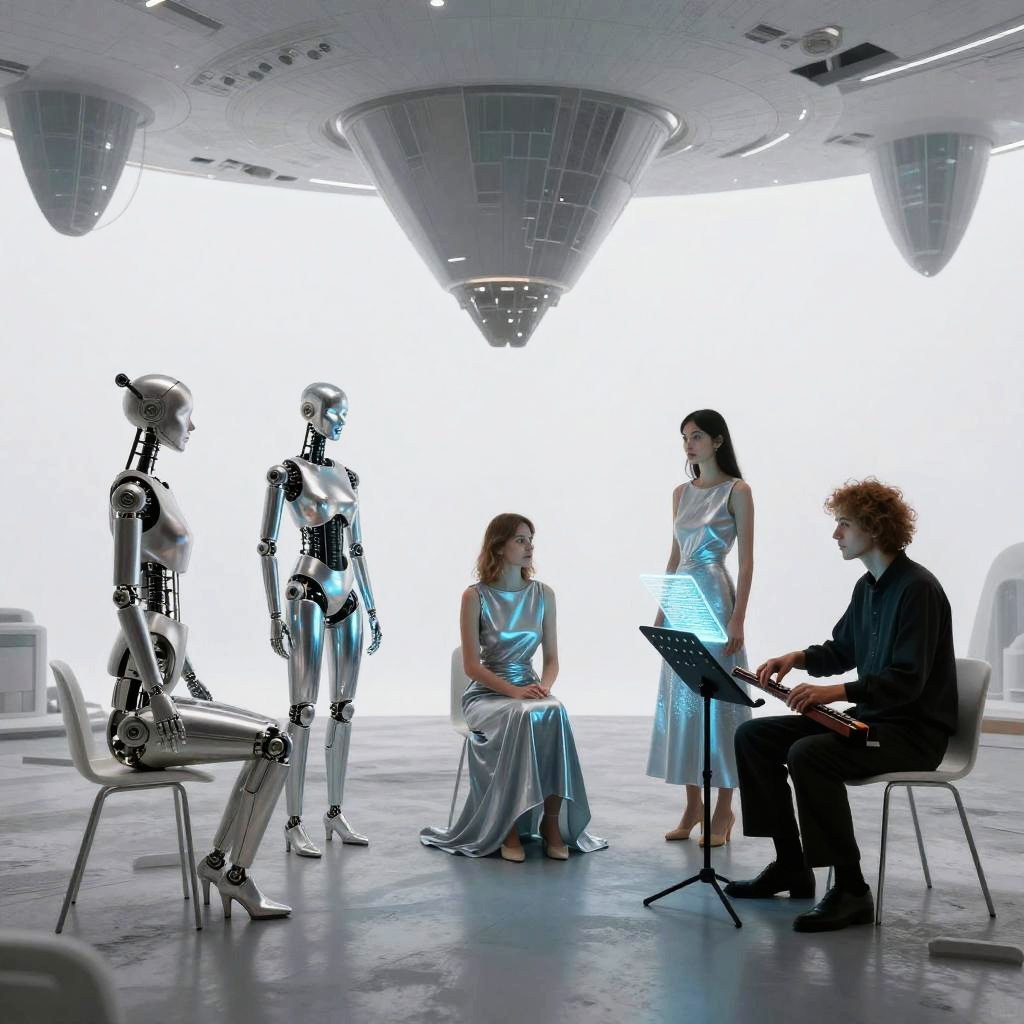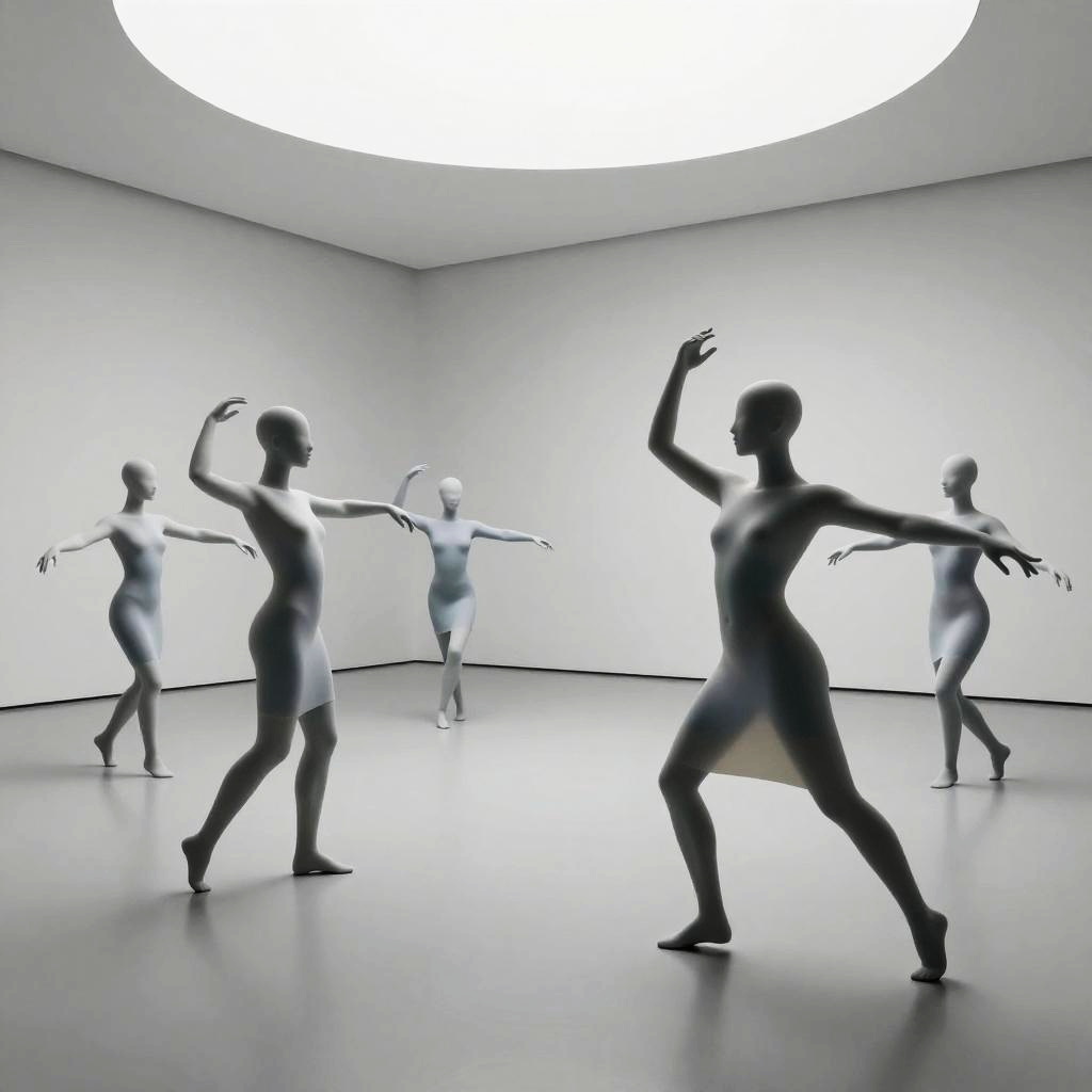 A futuristic minimalist shot of quantum hackers and interactive media painters wearing translucent light-bending garments, set in an ultramodern neural studio. Designed by Santiago Calatrava, Frank Lloyd Wright, captured with Fujifilm, experimental and stylish composition