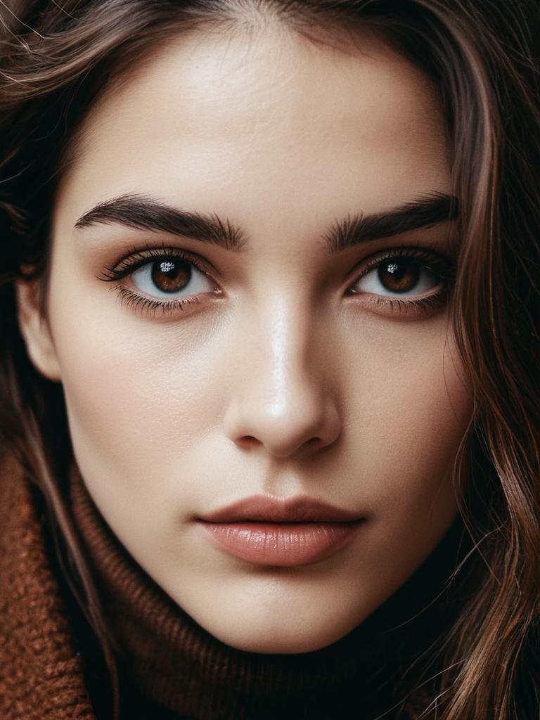 Close-up detailed headshot of a woman with natural makeup, brown eyes, and long brown hair. She is wearing a brown striped turtleneck sweater, presenting a soft and natural aesthetic.