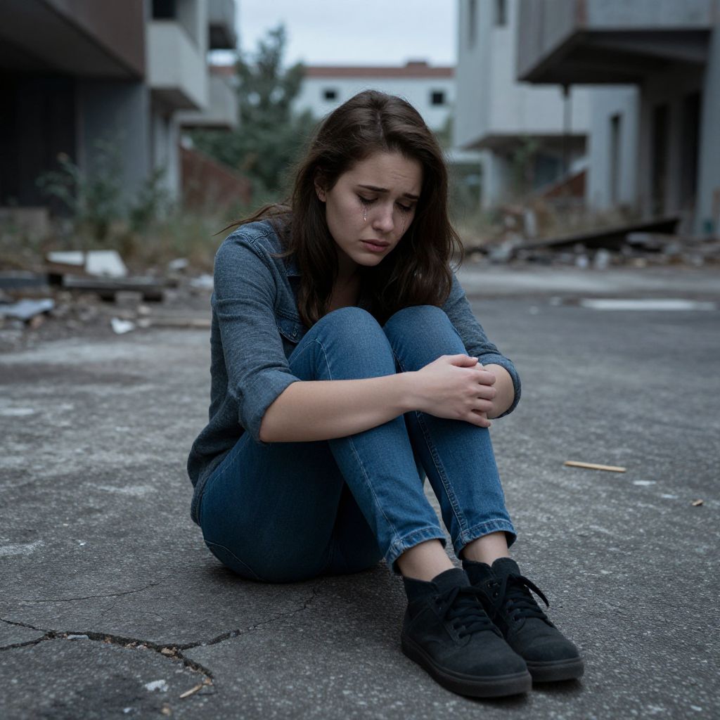 Despairing woman sitting on a cracked urban pavement, abandoned city in the background, gritty textures, muted colors dominated by blues and greys, tears streaming down her face, fine detail on the emotions, cinematic depth of field
