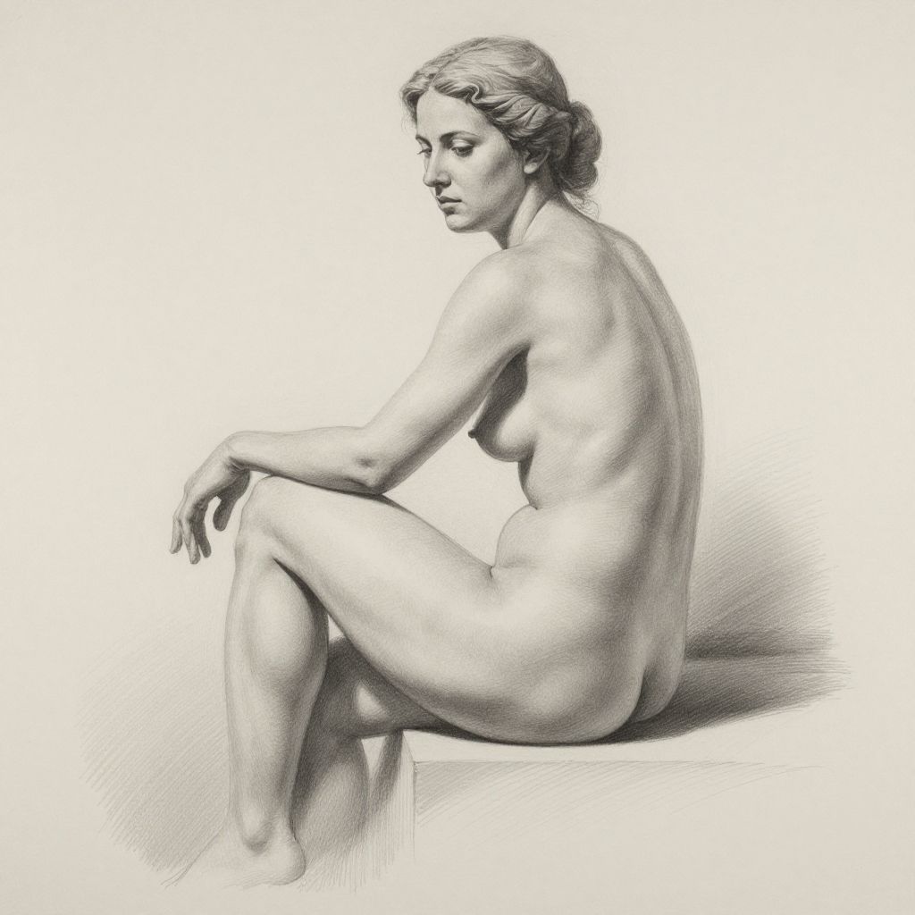 Sculpted pencil drawing depicts a nude woman seated gracefully, her body turned slightly to the side, with one arm resting on her knee and the other draped over her leg, showcasing intricate shading and detailed anatomical precision against a minimalist background.