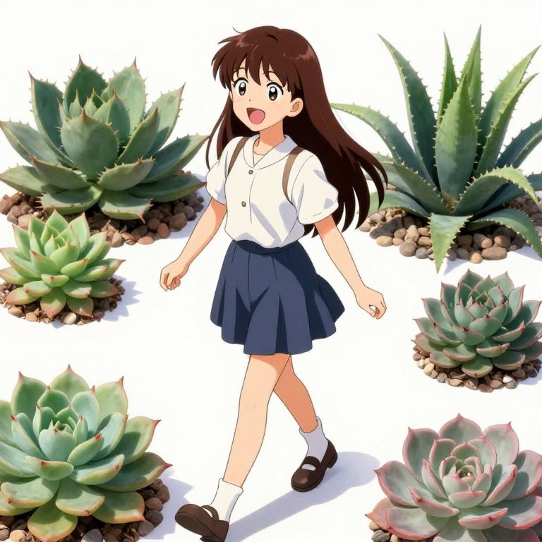 Antique japanese anime girl, high angle, walking, smiling, laughing, burst of laughter , with succulents and agave and aloe and echeveria and flower, brown long straight hair, white background,