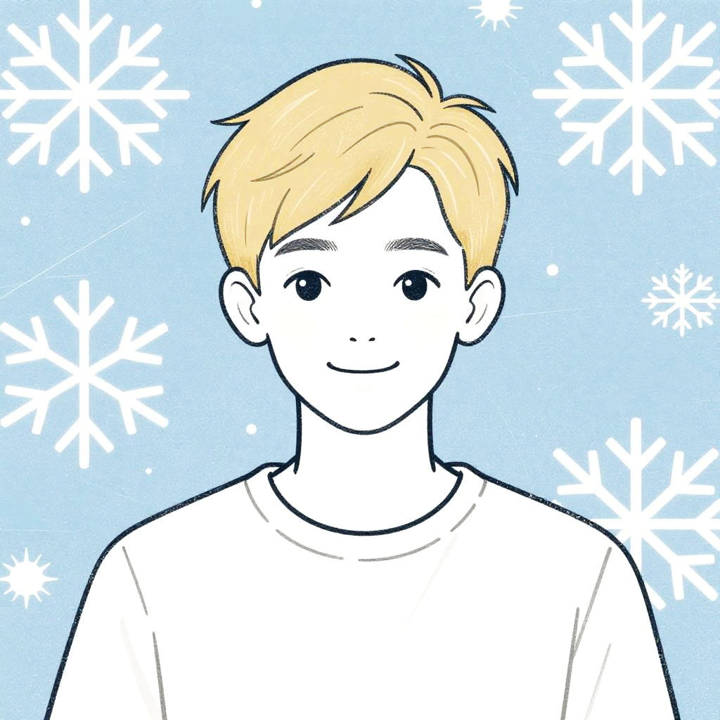 This is a linocut-style digital portrait of a Nordic teenage boy with short sandy blond hair, with a subtle smile, large expressive eyes, and a faint blush. The subject wears a simple light top with clean, slightly angular seams. Minimalist, sketch-like linework, soft edges, limited palette; the background is icy blue with white geometric snowflake patterns. Clean composition, gentle light, balanced negative space, modern editorial illustration.