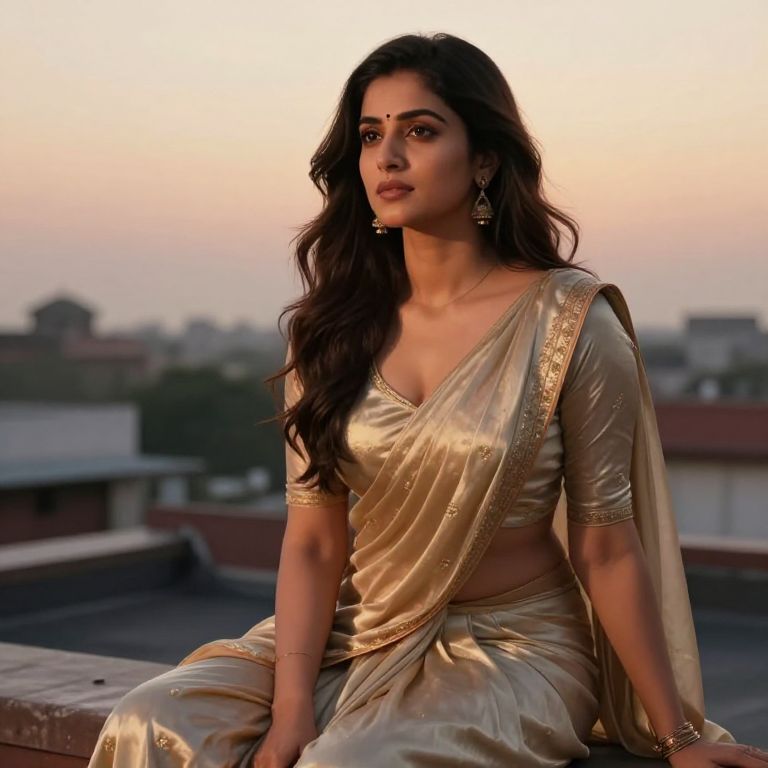 Bollywood actress AI, sitting on a rooftop in Delhi at twilight, wearing a silk choli and pants, looking into the distance, soft golden light, digital art style with cultural depth, realistic skin, natural expressions, cinematic, high detail, AI-generated portrait.