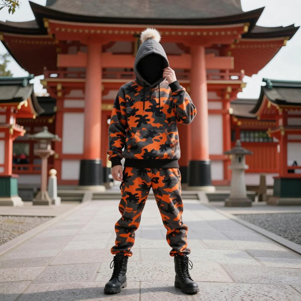 A photograph of a person standing outdoors in front of a traditional Japanese temple. They're wearing a black and orange camouflage hoodie with matching pants, black boots, and a gray hood with a fluffy white pom-pom. They're adjusting the hood with their right hand. The background shows a red torii gate with white roof tiles. The sunlight casts shadows on the stone pavement.
