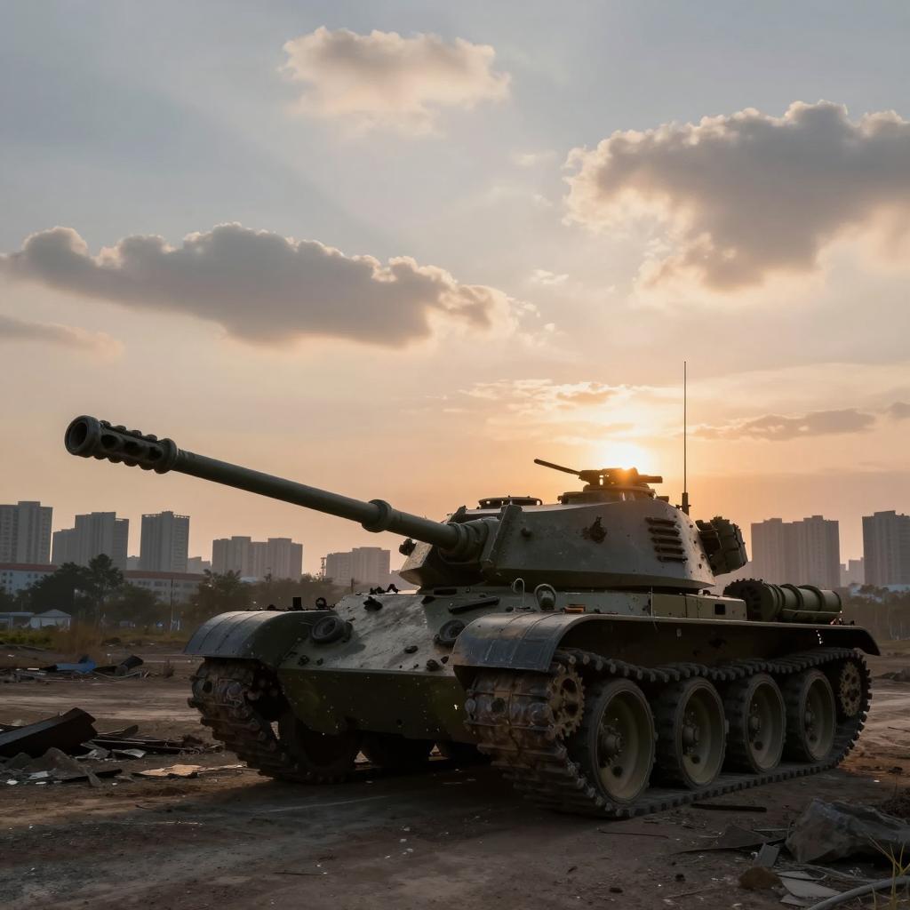 Motor vehicle, no humans, building, outdoors, sky, ruins, scenery, car, city, cityscape, cloud, tank, skyscraper, sunset, military vehicle, evening, post-apocalypse