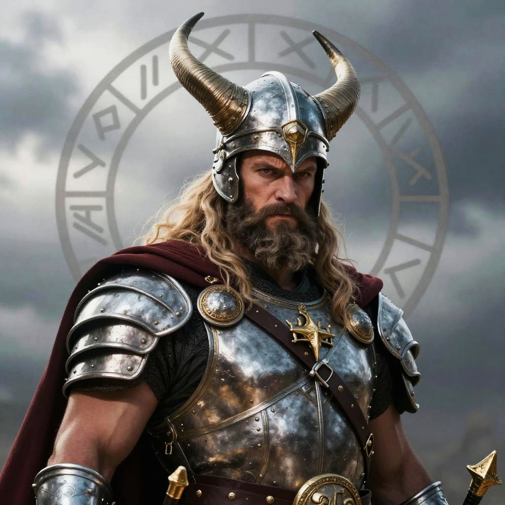 A digital artwork of a muscular, bearded man with long, wavy blonde hair wearing a shiny, ornate Viking-style helmet with large, curved horns. He's clad in detailed, silver armor with gold accents and a dark red cape. The background is a misty, cloudy sky with a circular, rune-like symbol behind him, adding a mystical, epic vibe. The lighting is dramatic, highlighting his intense, focused expression.