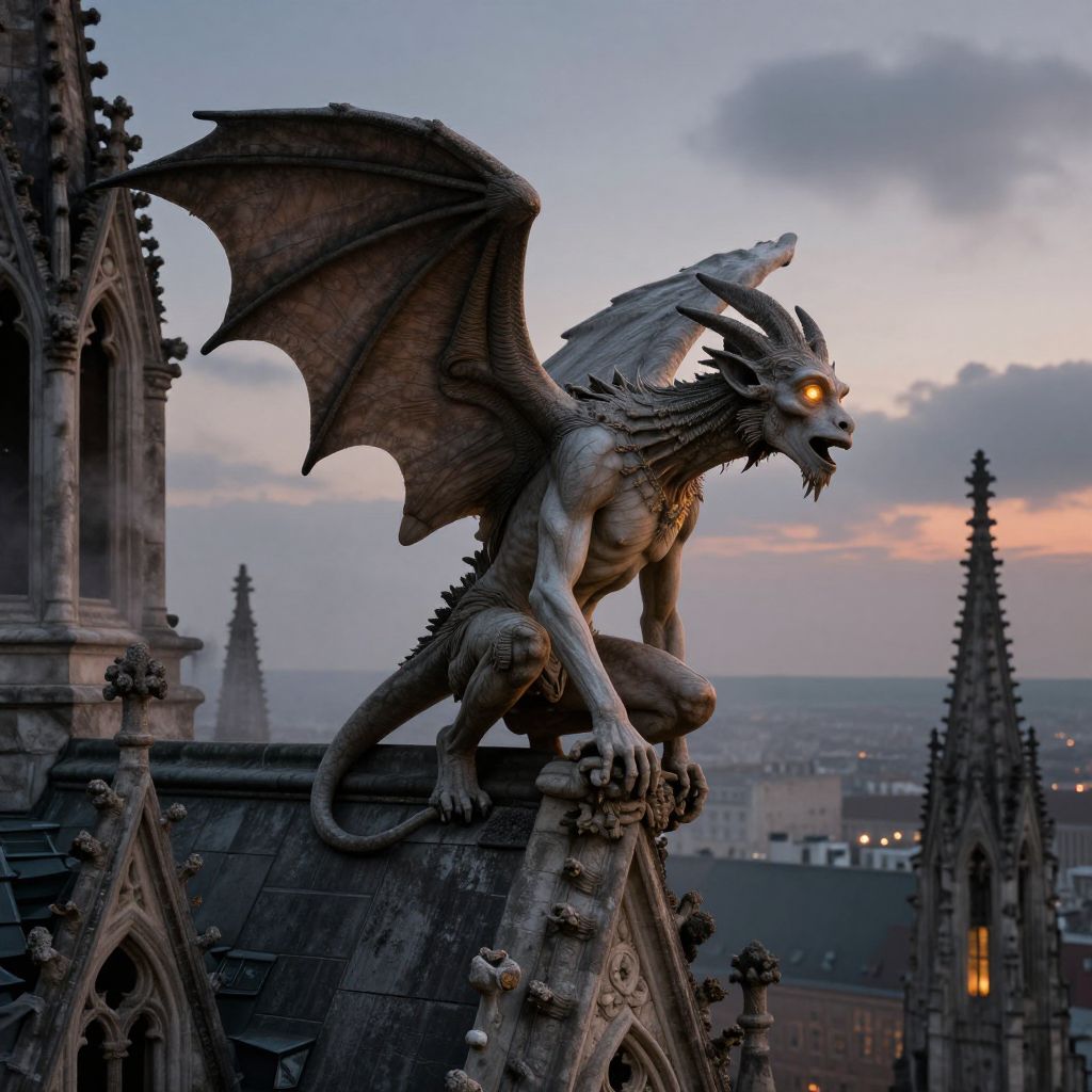Photograph of a detailed, menacing stone gargoyle with glowing yellow eyes perched on a gothic cathedral rooftop at dusk.