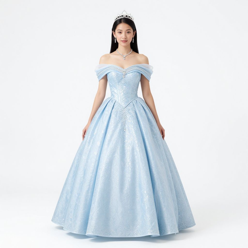 Photograph of an Asian woman with long black hair, wearing a light blue, off-the-shoulder, satin ball gown with a fitted bodice and full skirt. She has a delicate tiara on her head and a pearl necklace around her neck. Her expression is neutral, and she stands against a plain white background, highlighting the elegance of her dress. The gown has subtle floral embroidery and a slight sheen, adding to its regal appearance. Her arms are relaxed at her sides.