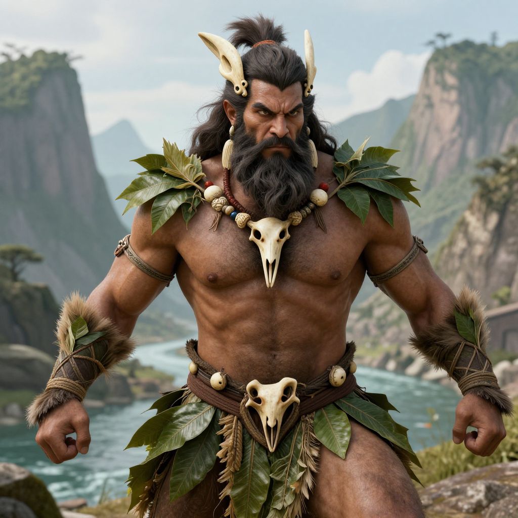 CGI image of a muscular, bearded warrior with dark skin, wearing leafy armor, skull necklace, and animal skull belt, standing in a