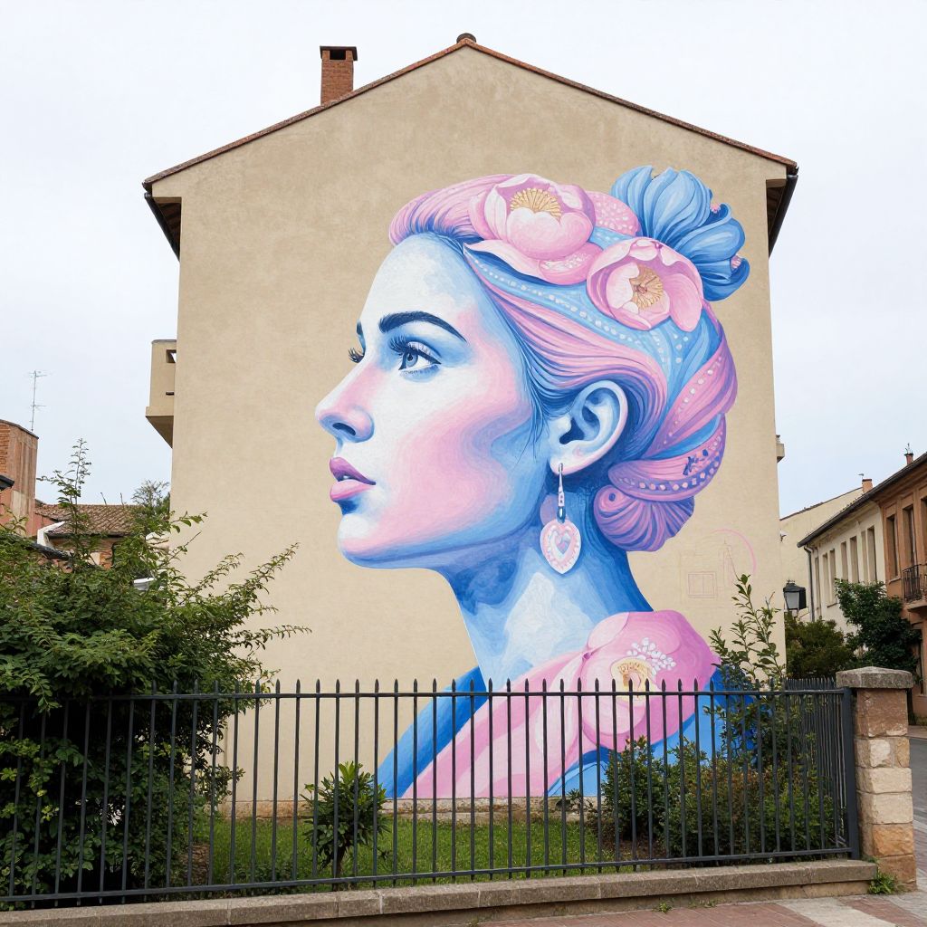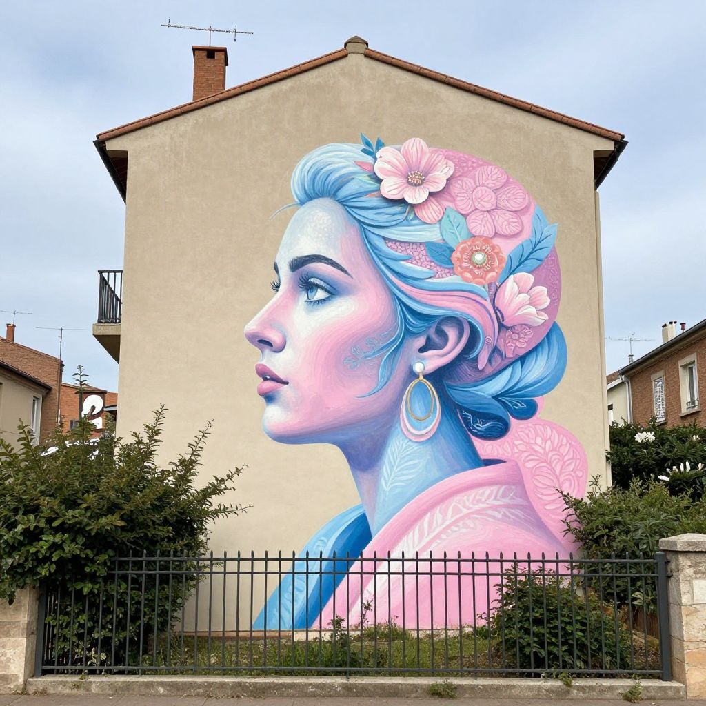 Vivid street art mural depicting a profile of a woman's face painted in pastel shades of pink and blue, adorned with floral patterns, dominates the side of a beige building in Toulouse, France, with a metal fence and greenery below.