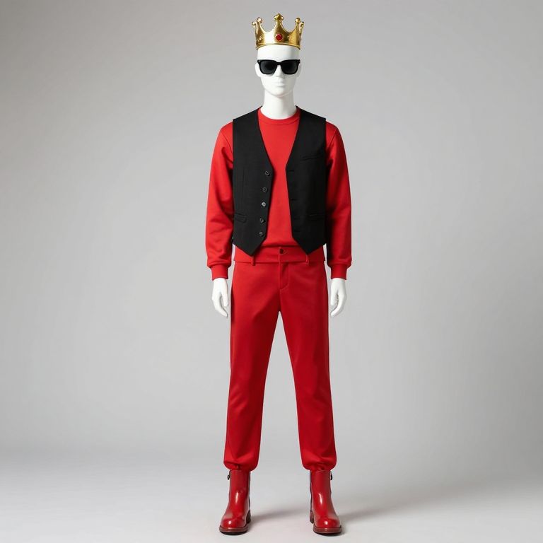 Mannequin wearing a red coat with gold embroidery and a crown on his head.