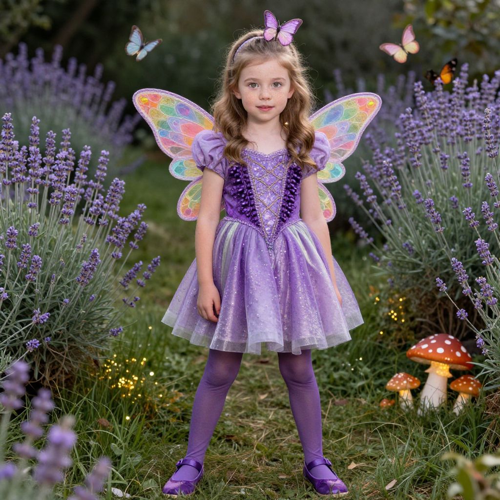 Photograph of a young girl standing in a magical forest. She has long brown hair, fair skin, and wears a sparkly lavender dress with puffed sleeves and purple tights. Her fairy wings are colorful and translucent, adorned with rainbow hues. A pink butterfly hairpiece sits on her head. She is surrounded by lavender bushes, green grass, and glowing fairy lights. Notable elements include red-and-white spotted mushrooms on the right and three colorful butterflies in the background. She wears purple shoes, completing her enchanting fairy look. The image has a whimsical, fairy-tale quality.